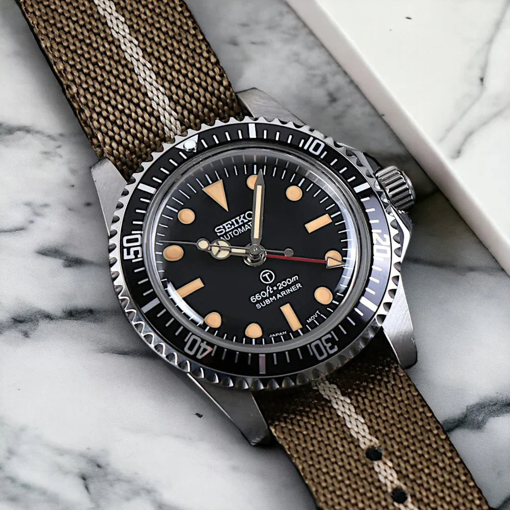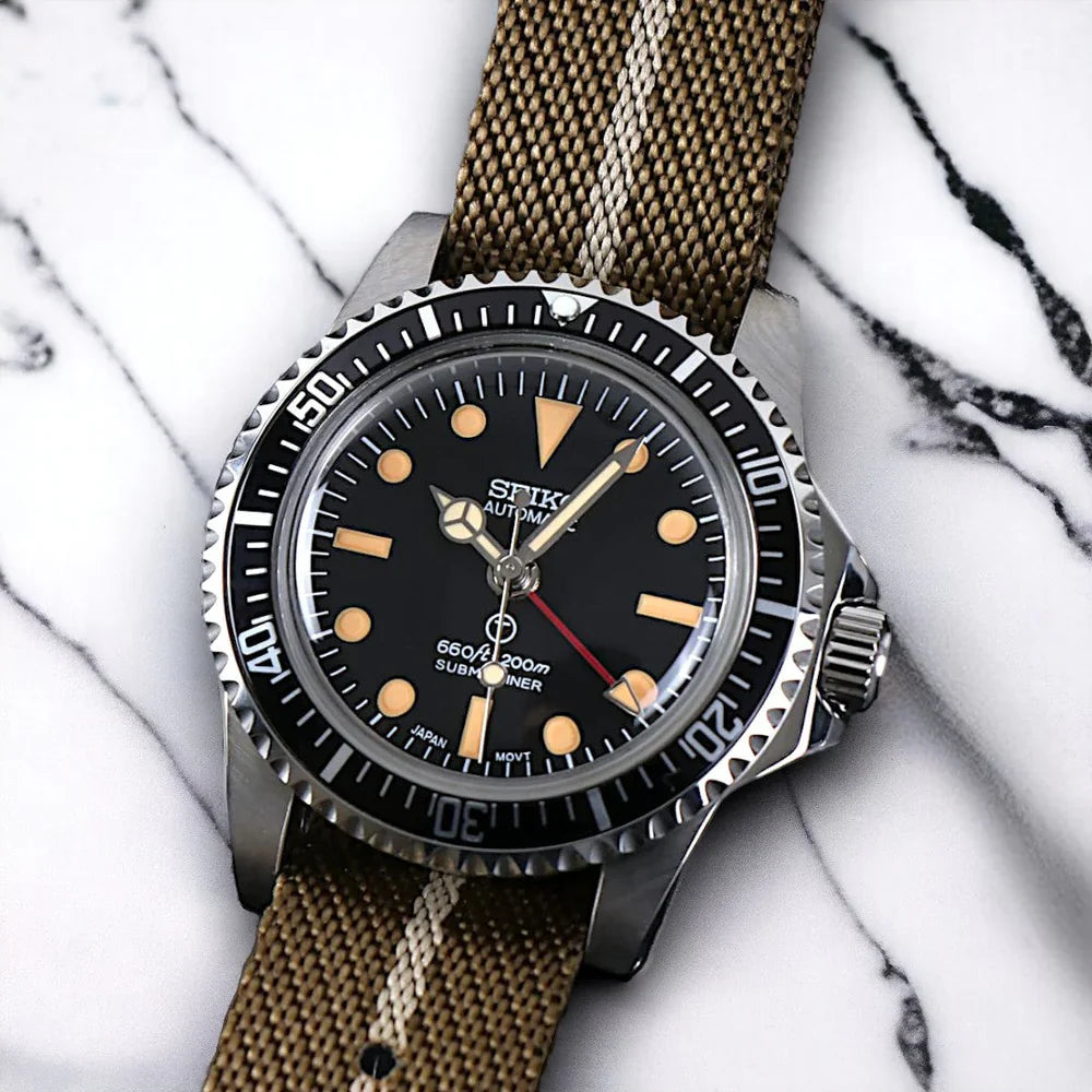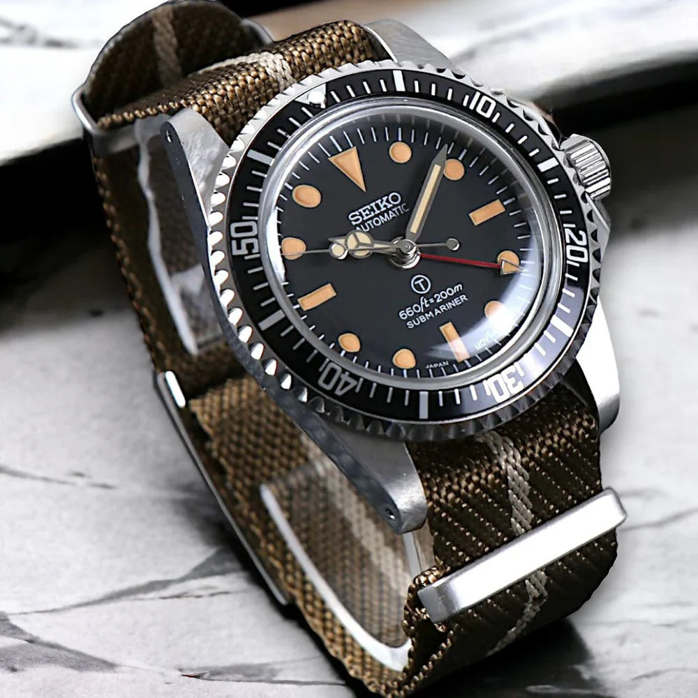 Dive into history with our Custom Seiko MilSub Vintage GMT Mod Watch, a tasteful blend of renowned craftsmanship and the classic aesthetics of the iconic military submariner designs. Powered by the reliable NH34 Automatic Movement, this timepiece stands as a beacon of reliability and precision. It's crafted for aficionados who value both historical significance and modern watchmaking brilliance.