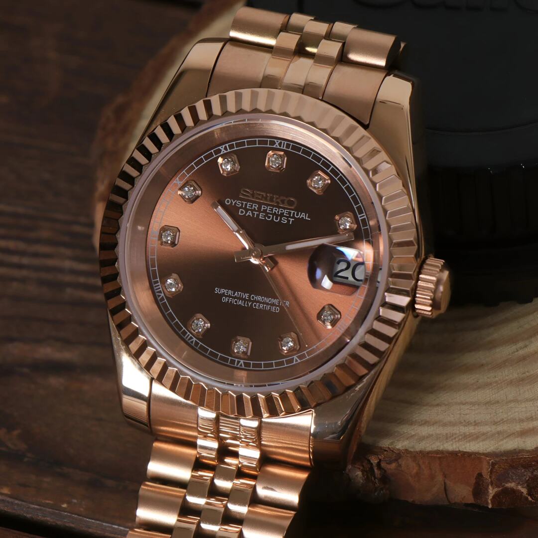Discover the Seiko Mod Datejust Rose Gold Crystal Champagne, a meticulously crafted NH35 Automatic Watch, inspired by the iconic Datejust design. This elegant timepiece features a Crystal Champagne aftermarket dial, encased in a 36 mm or 39 mm fluted bezel, offering a blend of style and precision for watch enthusiasts.