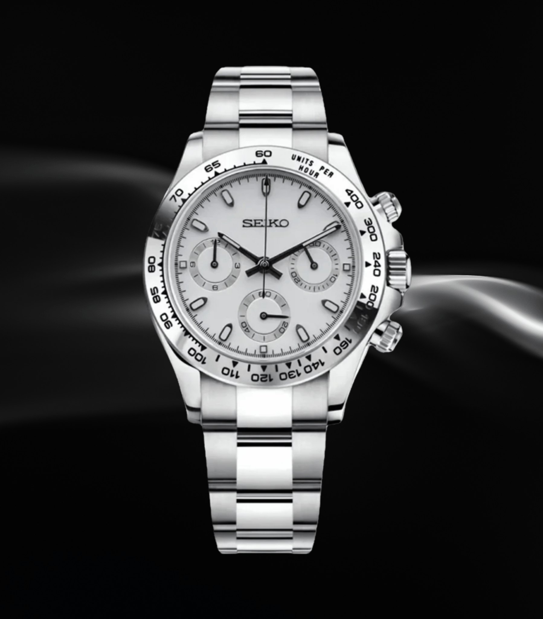 Elevate your style with the Seiko Mod Daytona Ceramic White, a custom Seiko VK63 Mechanical Quartz Watch, inspired by the iconic “Daytona” design. This unique timepiece features a Panda dial, encased in a 40mm stainless steel frame, offering a blend of elegance and precision for watch enthusiasts.