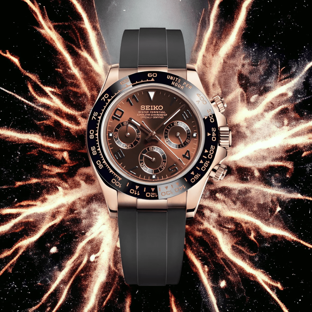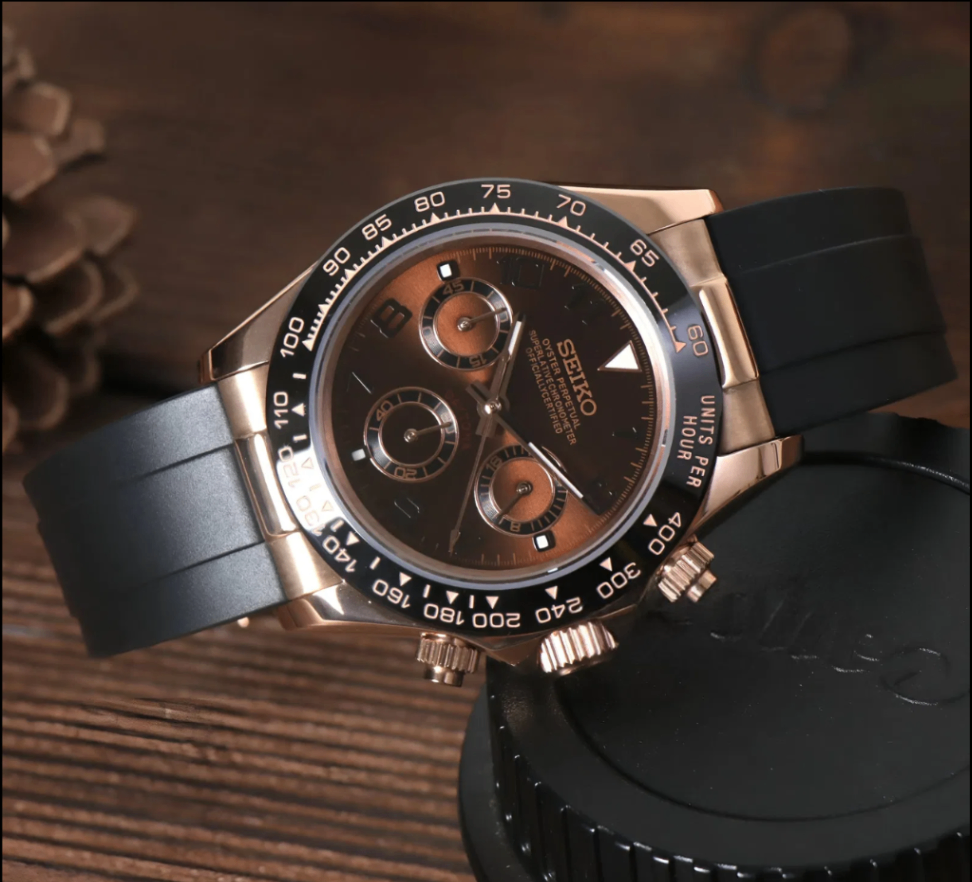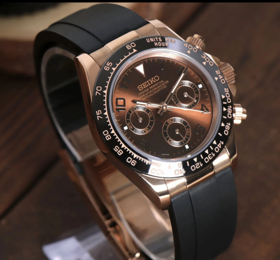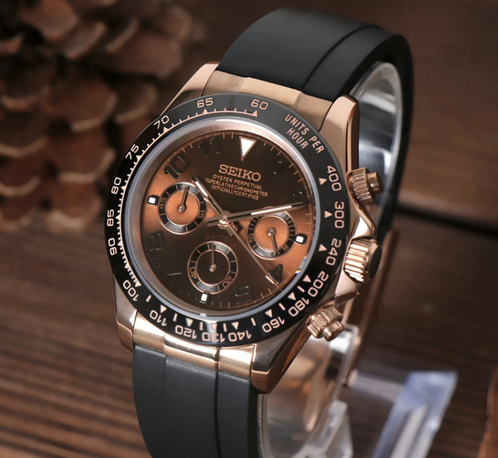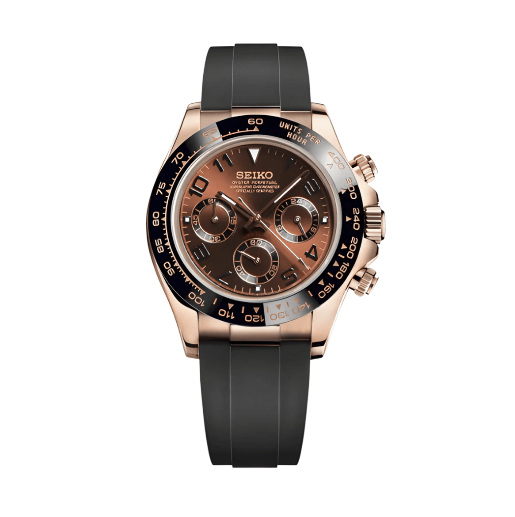 Elevate your style with the Daytona Chocolate, a custom Seiko VK63 Mechanical Quartz Watch, inspired by the iconic “Daytona” design. This unique timepiece features a Chocolate dial, encased in a 40mm stainless steel frame, offering a blend of elegance and precision for watch enthusiasts.