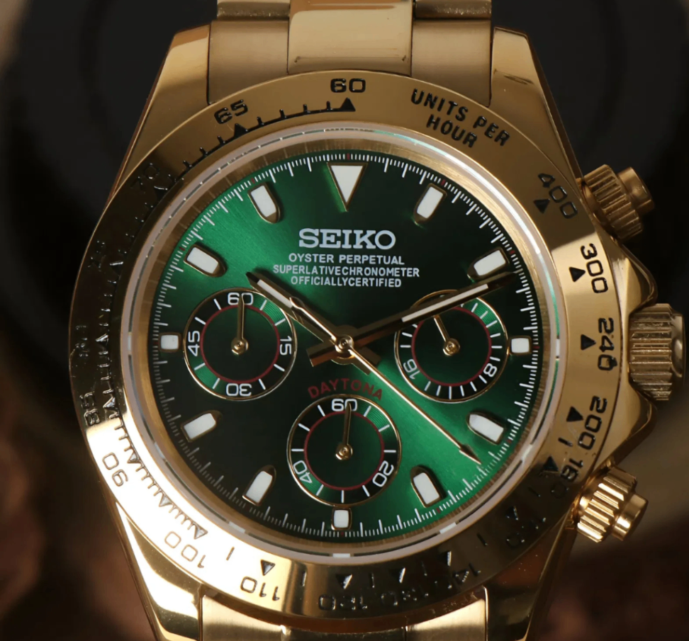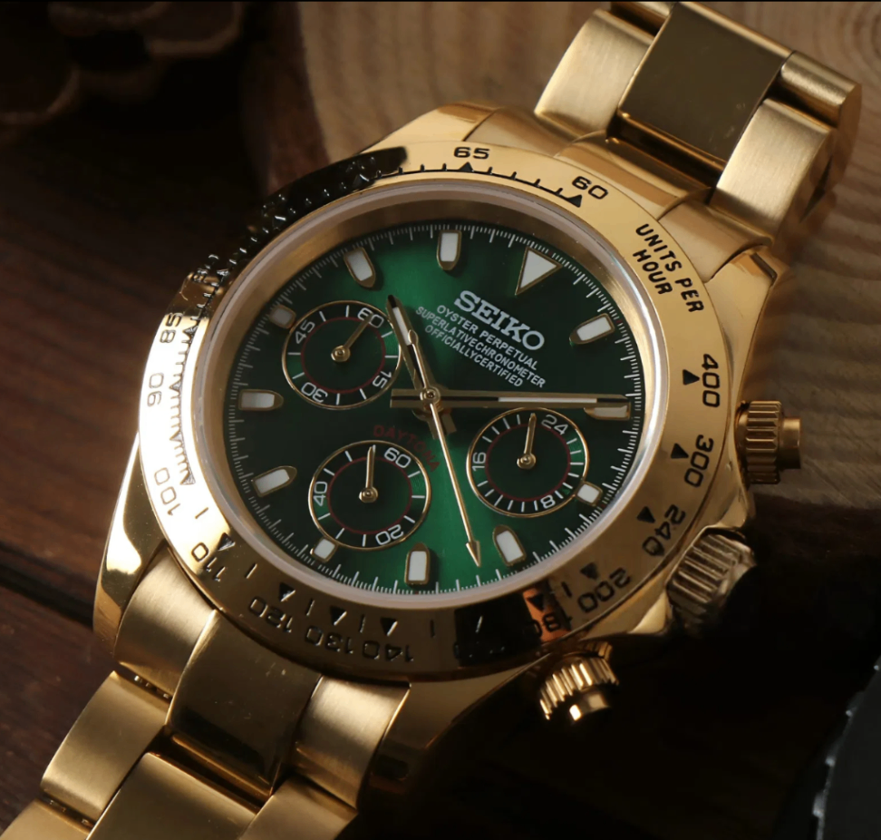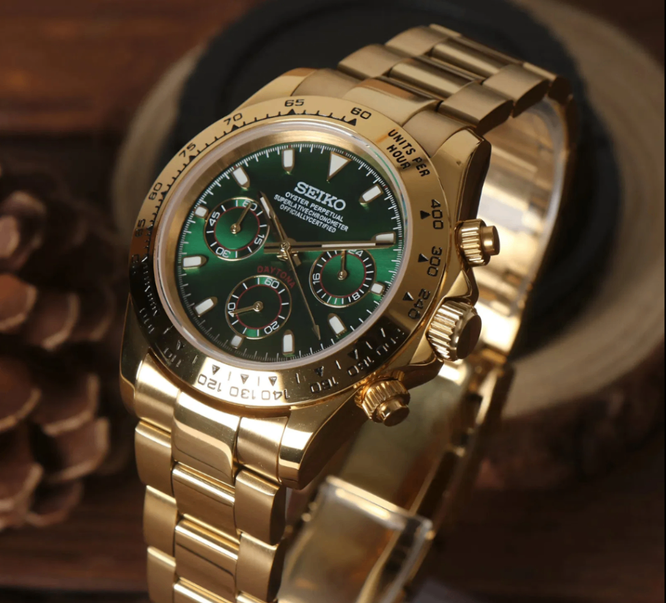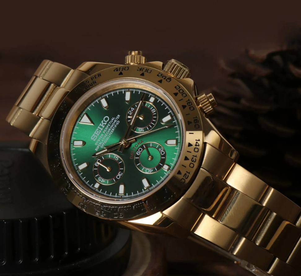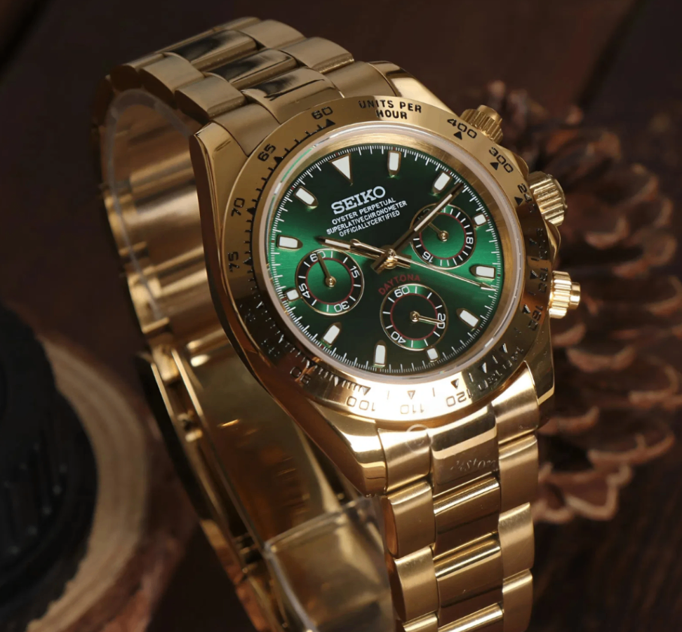 Elevate your style with the Seiko Mod Daytona "John Mayer", a custom Seiko VK63 Mechanical Quartz Watch, inspired by the iconic “Daytona John Mayer” design. This unique timepiece features a Gold Green dial, encased in a 40mm stainless steel frame, offering a blend of elegance and precision for watch enthusiasts.