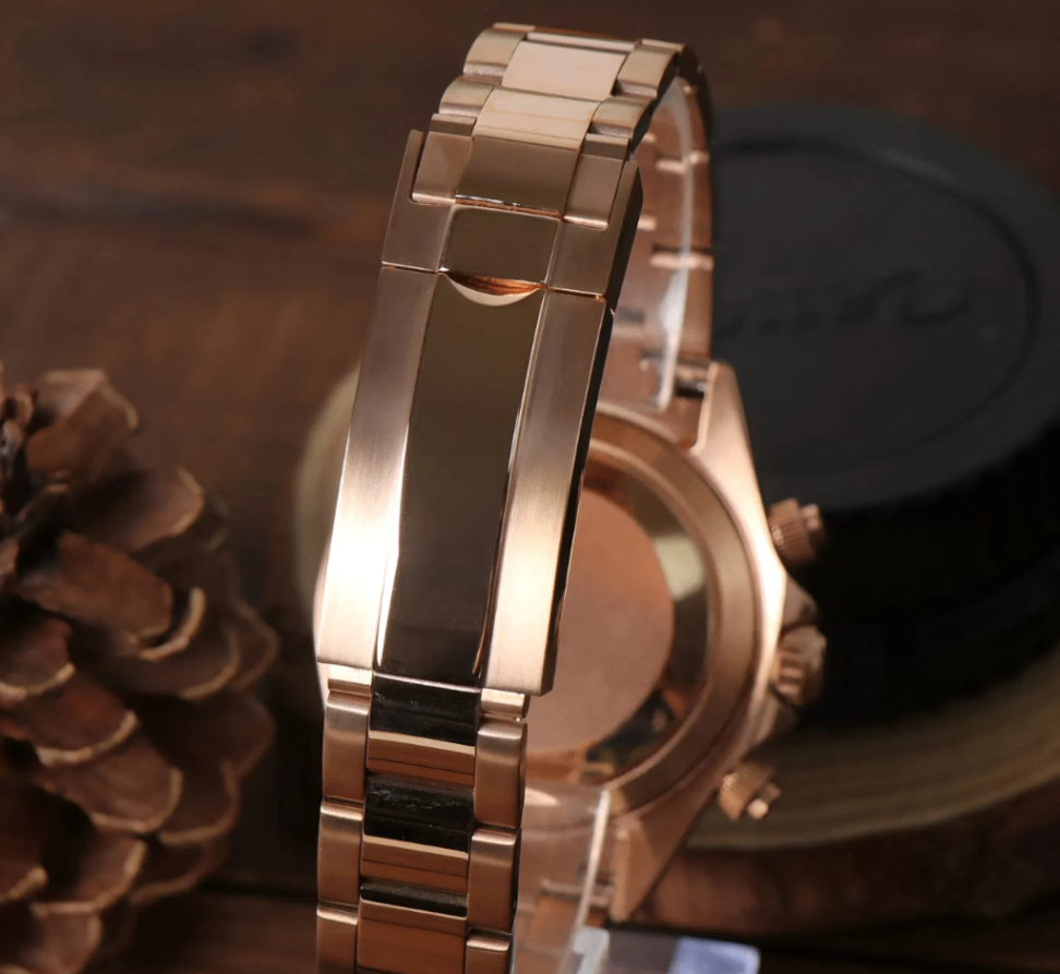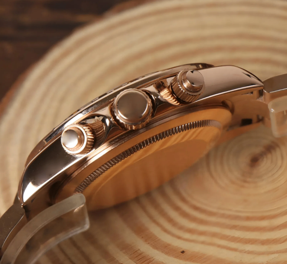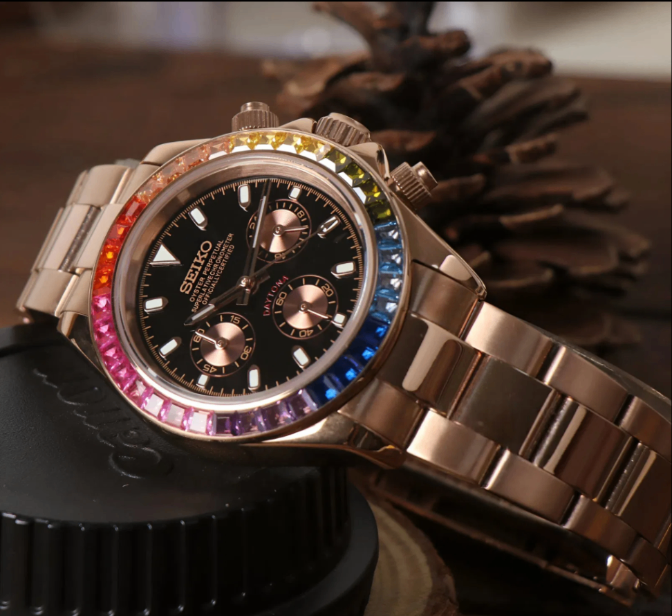 Elevate your style with the Daytona Rose Gold - Rainbow , a custom Seiko VK63 Mechanical Quartz Watch, inspired by the iconic “Daytona” design. This unique timepiece features a Rainbow dial, encased in a 40mm stainless steel frame, offering a blend of elegance and precision for watch enthusiasts.