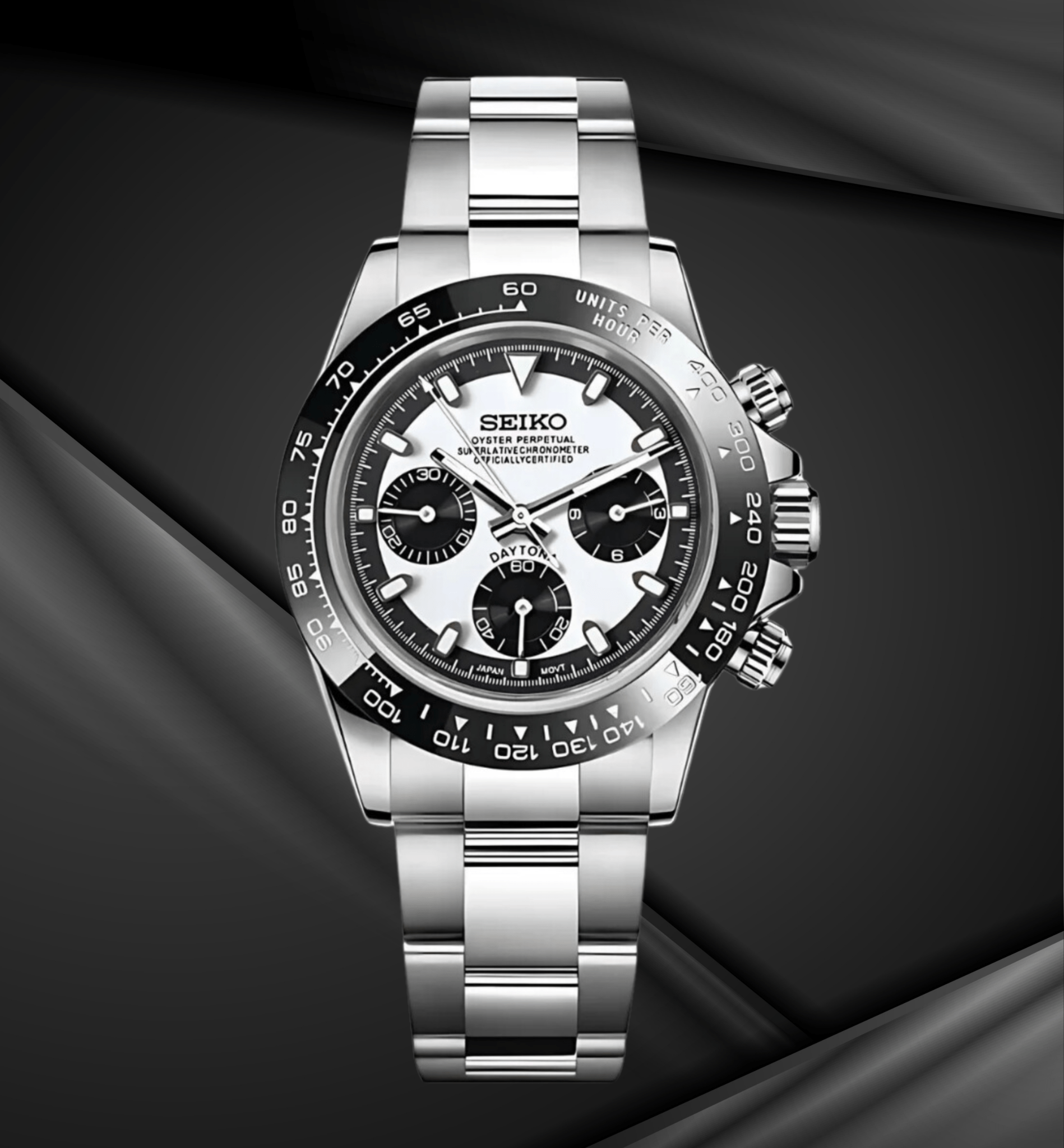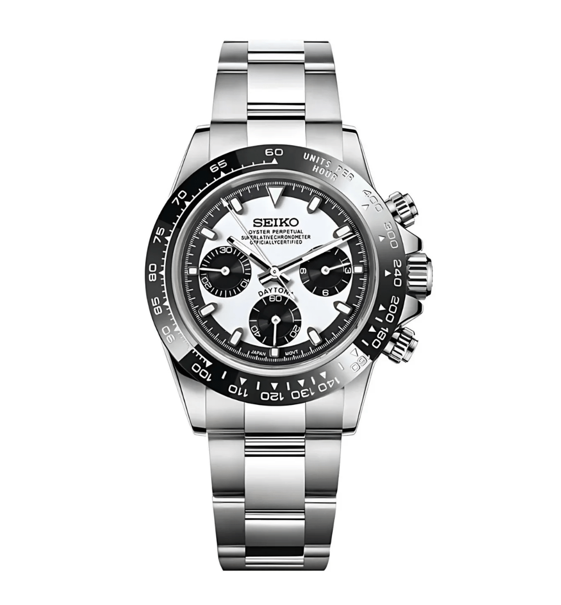 Elevate your style with the Daytona White Ceramic, a custom Seiko VK63 Mechanical Quartz Watch, inspired by the iconic “Daytona” design. This unique timepiece features a White Ceramic dial, encased in a 40mm stainless steel frame, offering a blend of elegance and precision for watch enthusiasts.