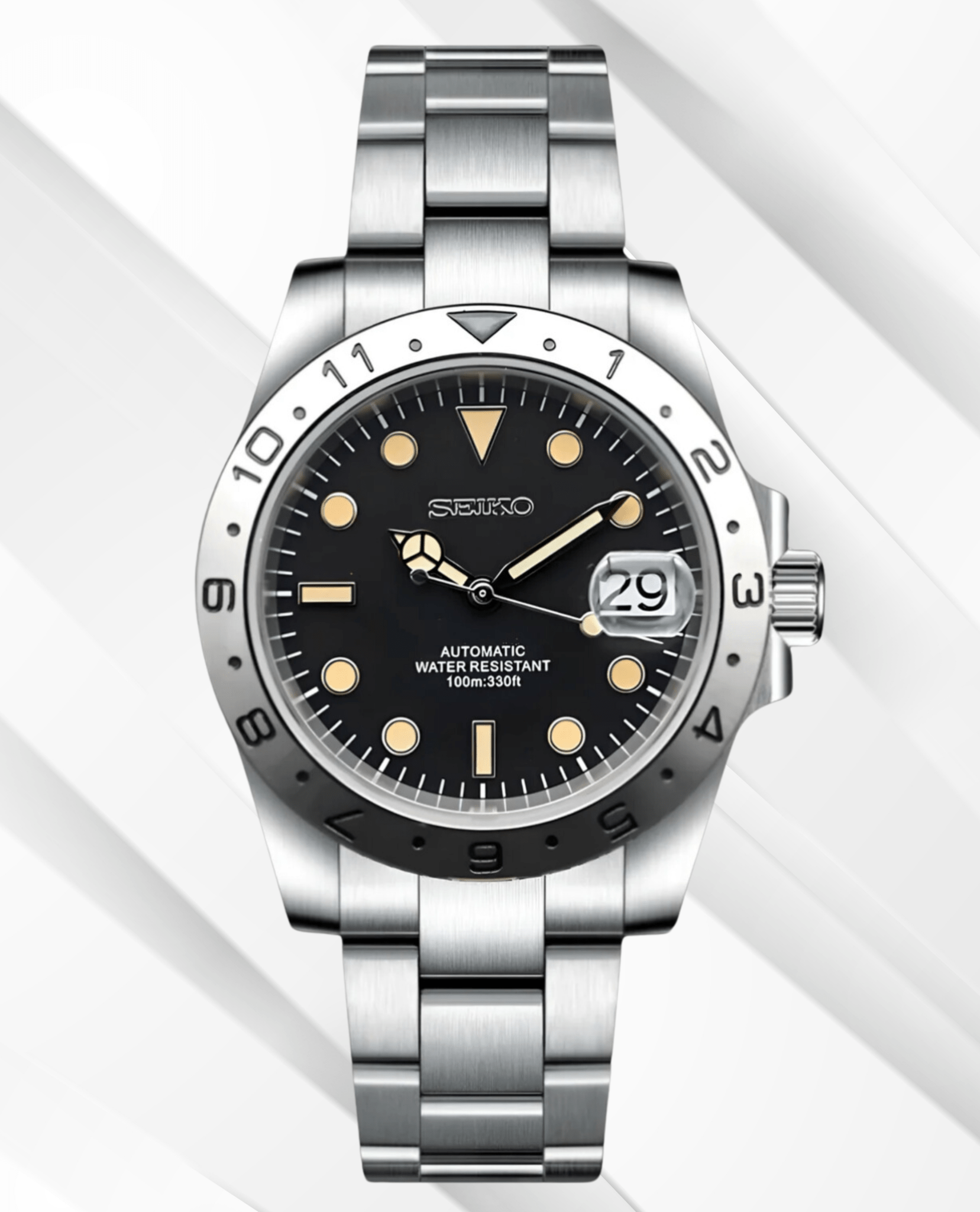 Introducing the Seiko Mod Explorer Submariner, a custom NH35 Automatic Watch inspired by the iconic Explorer Submariner design, meticulously crafted for those who appreciate elegance and precision. This model features a Submariner Black aftermarket dial and a transparent back piece, allowing a glimpse into the intricate automatic movement.