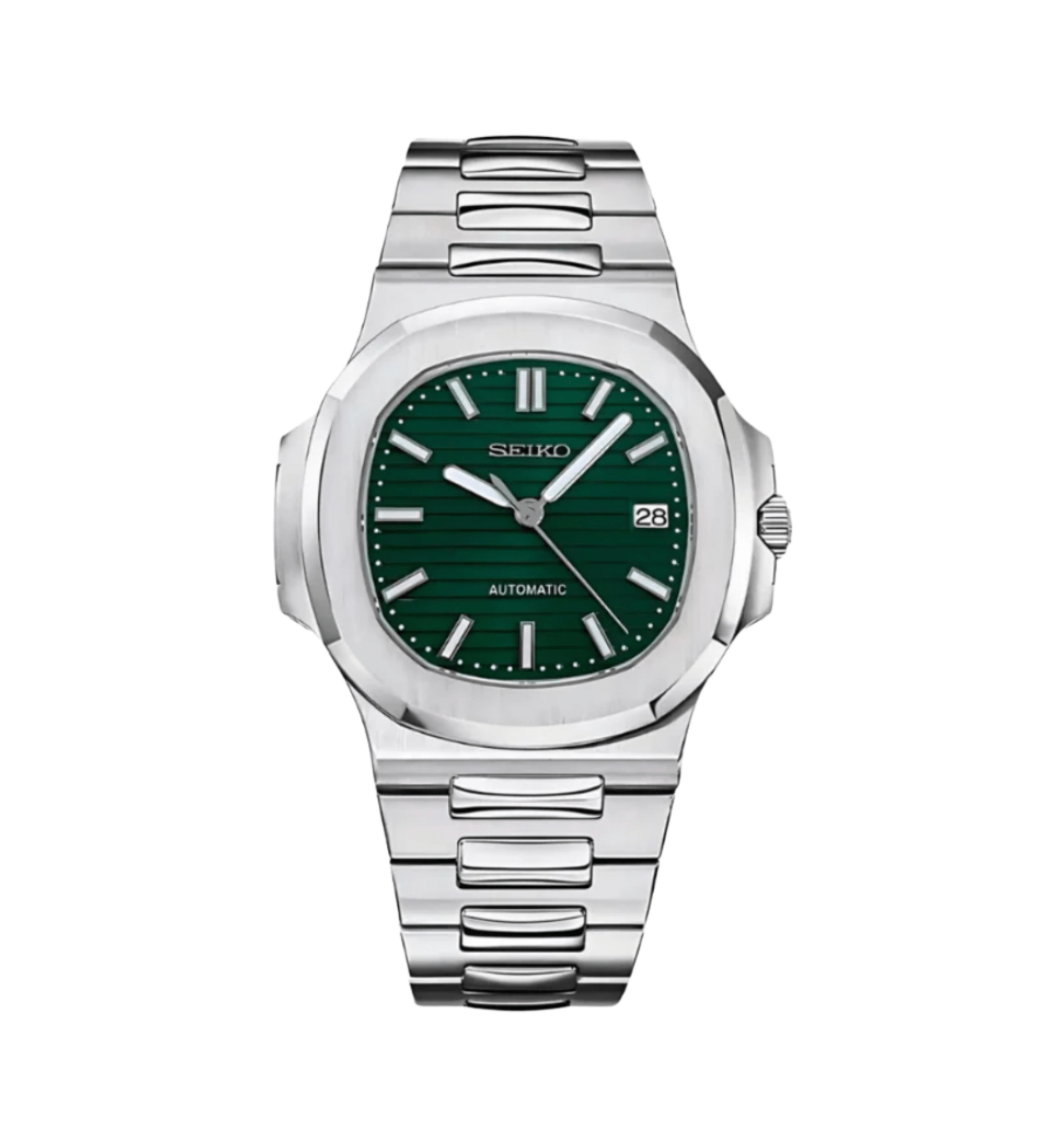 Introducing the Seiko Mod Nautilus Silver Green, a custom Seiko NH35 Automatic Watch inspired by the iconic Nautilus design, meticulously crafted for those who appreciate elegance and precision. This model features a Silver Green aftermarket dial and a transparent back piece, allowing a glimpse into the intricate automatic movement.