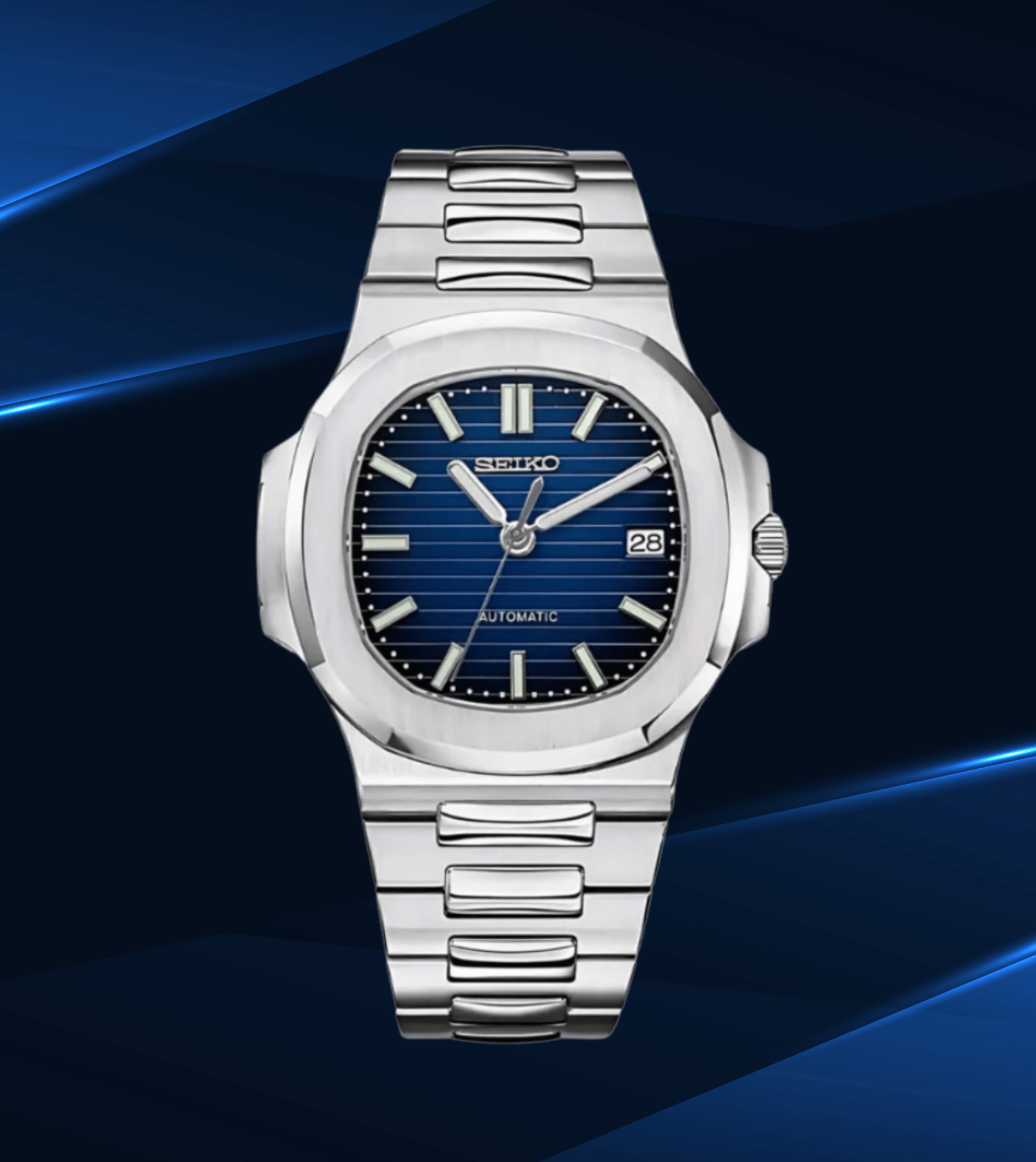 Introducing the Seiko Mod Nautilus Silver Blue, a custom Seiko NH35 Automatic Watch inspired by the iconic Nautilus design, meticulously crafted for those who appreciate elegance and precision. This model features an Blue Ocean aftermarket dial and a transparent back piece, allowing a glimpse into the intricate automatic movement.