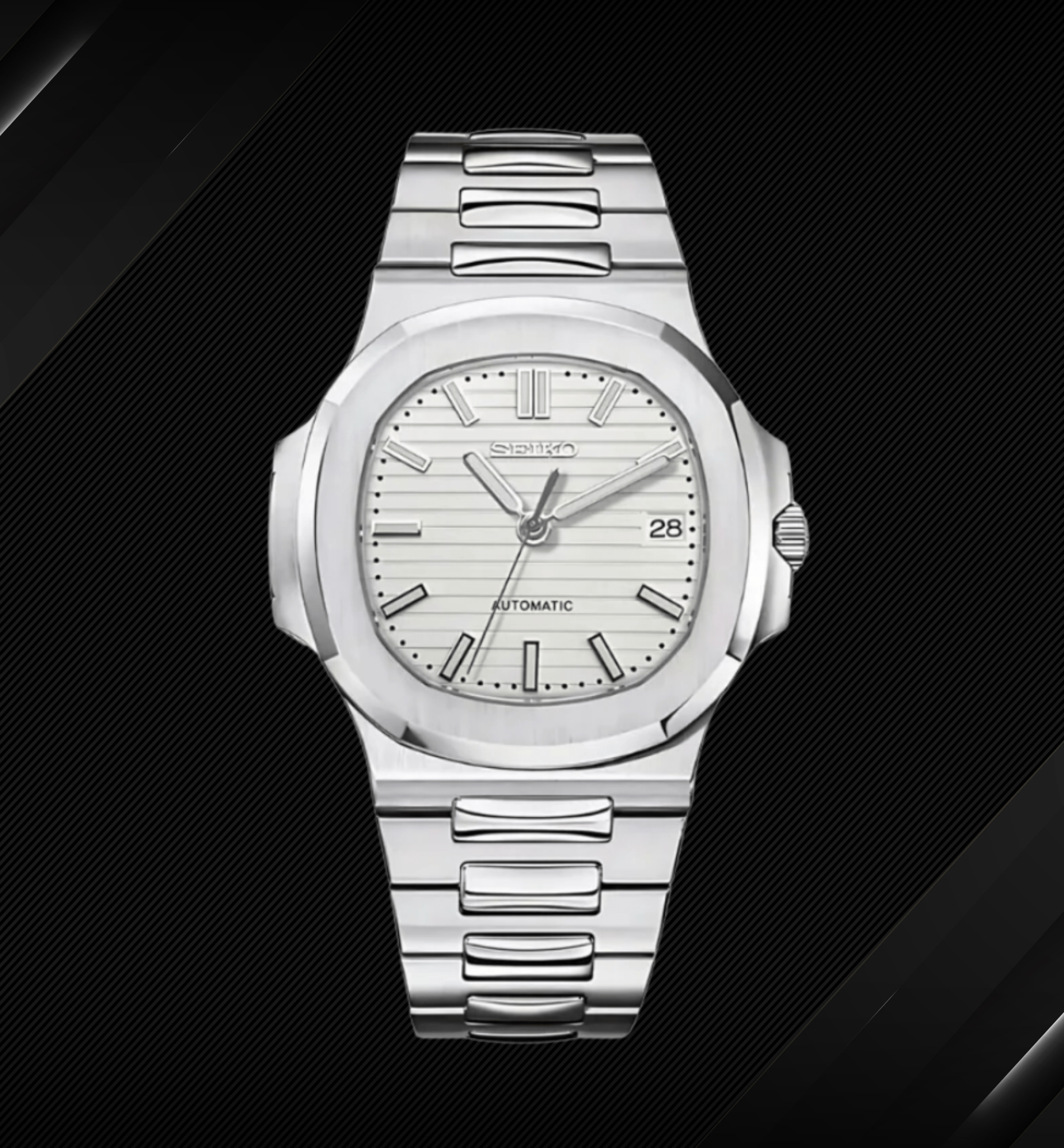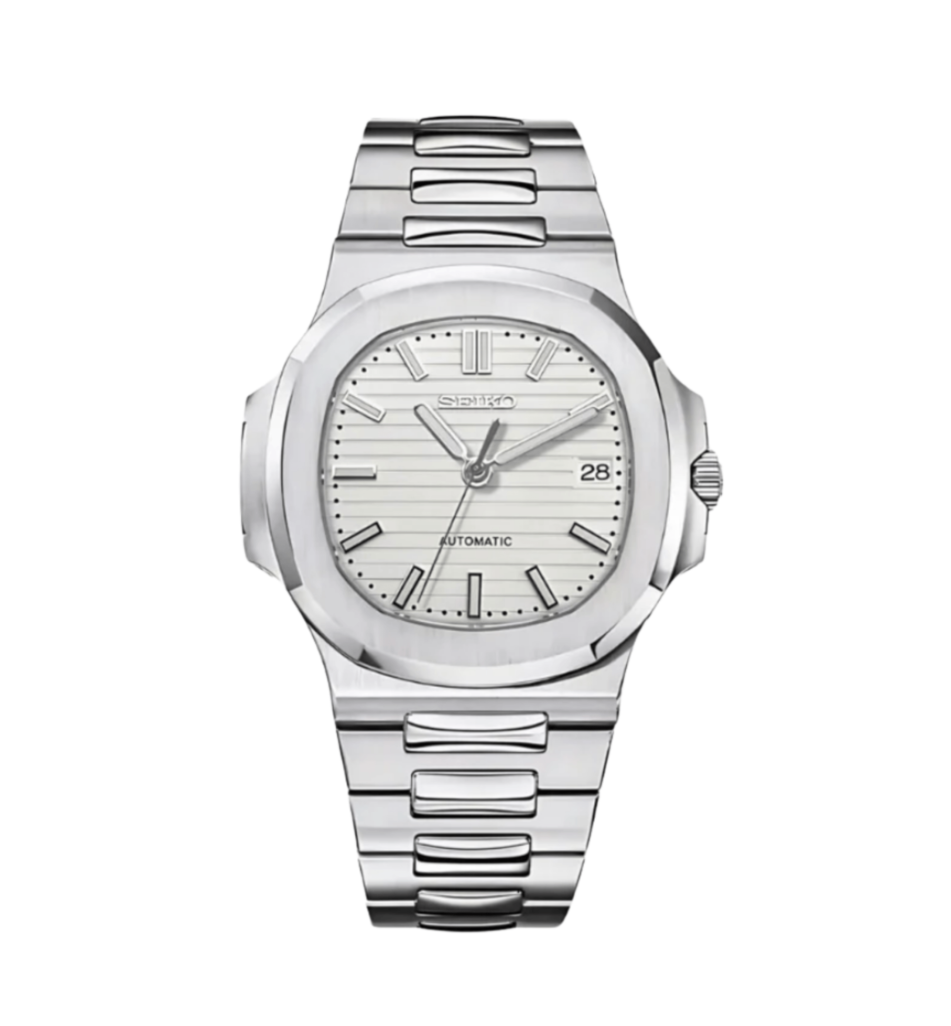 Introducing the Seiko Mod Nautilus Silver White, a custom Seiko NH35 Automatic Watch inspired by the iconic Nautilus design, meticulously crafted for those who appreciate elegance and precision. This model features a Silver White aftermarket dial and a transparent back piece, allowing a glimpse into the intricate automatic movement.