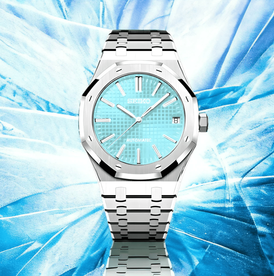 Introducing the Seiko Mod Royal Oak Light Blue, a custom Seiko NH35 Automatic Watch inspired by the iconic Royal Oak design, meticulously crafted for those who seek elegance and precision. This model features a Light Blue aftermarket dial and a transparent back piece, allowing a glimpse into the intricate automatic movement.