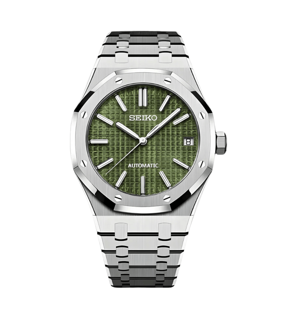 Introducing the Seiko Mod Royal Oak Olive Green, a custom Seiko NH35 Automatic Watch inspired by the iconic Royal Oak design, meticulously crafted for those who seek elegance and precision. This model features a Olive Green aftermarket dial and a transparent back piece, allowing a glimpse into the intricate automatic movement.