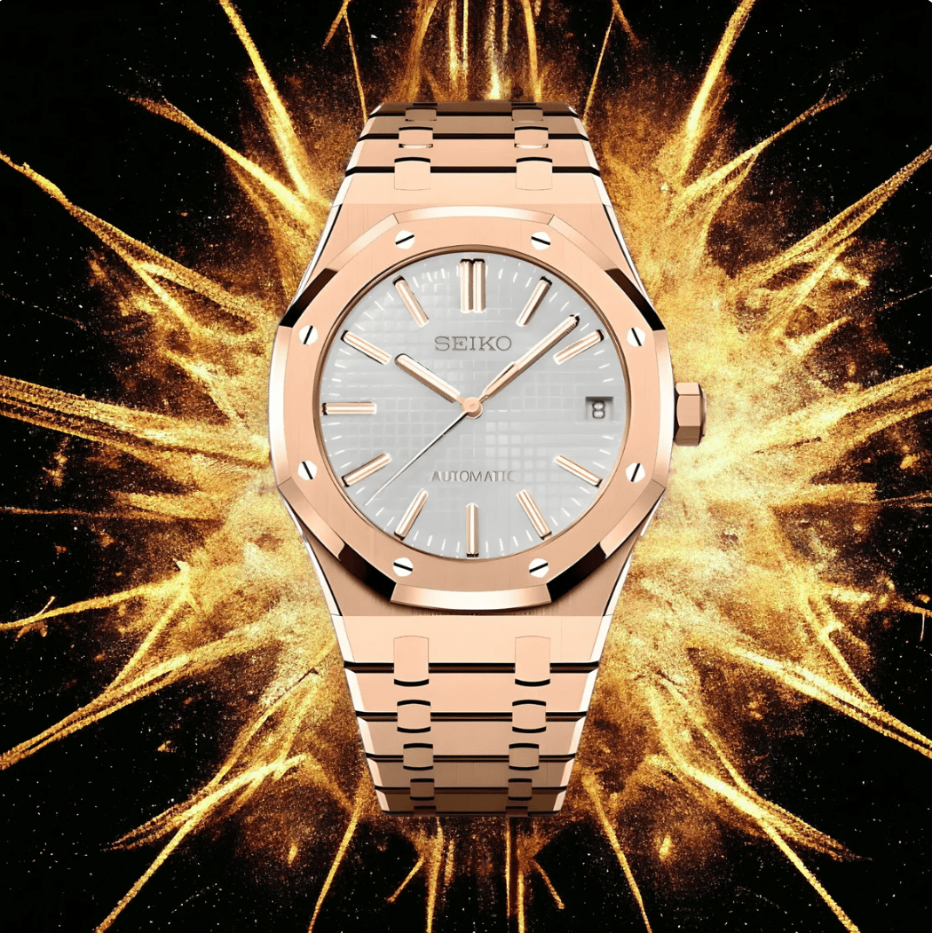 Introducing the Seiko Mod Royal Oak Rose Gold - White, a custom Seiko NH35 Automatic Watch inspired by the iconic Royal Oak design, meticulously crafted for those who seek elegance and precision. This model features a White aftermarket dial and a transparent back piece, allowing a glimpse into the intricate automatic movement.