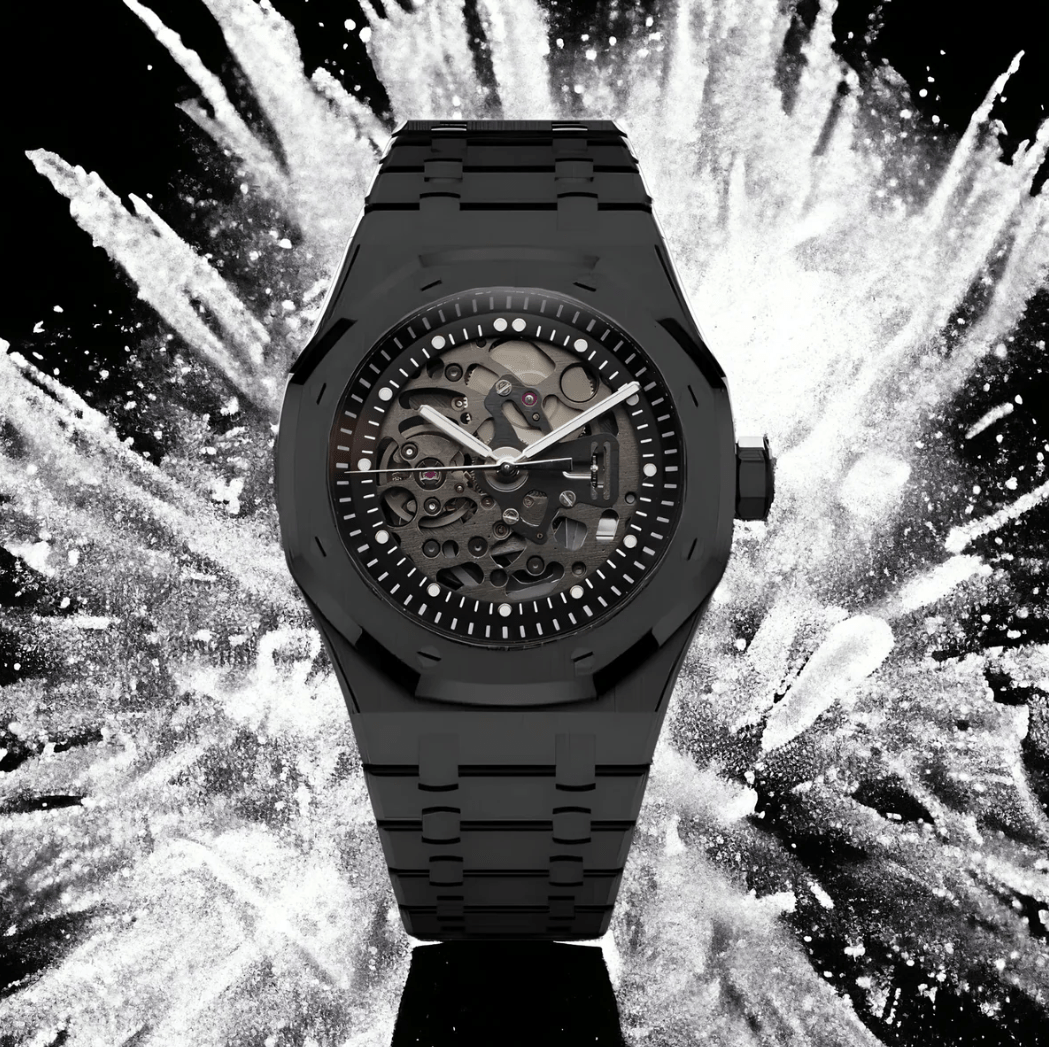 Introducing the Seiko Mod Royal Oak Skeleton Black, a custom Seiko NH70 Automatic Watch inspired by the iconic Royal Oak design, meticulously crafted for those who seek elegance and precision. This model features a Skeleton Black aftermarket dial and a transparent back piece, allowing a glimpse into the intricate automatic movement.