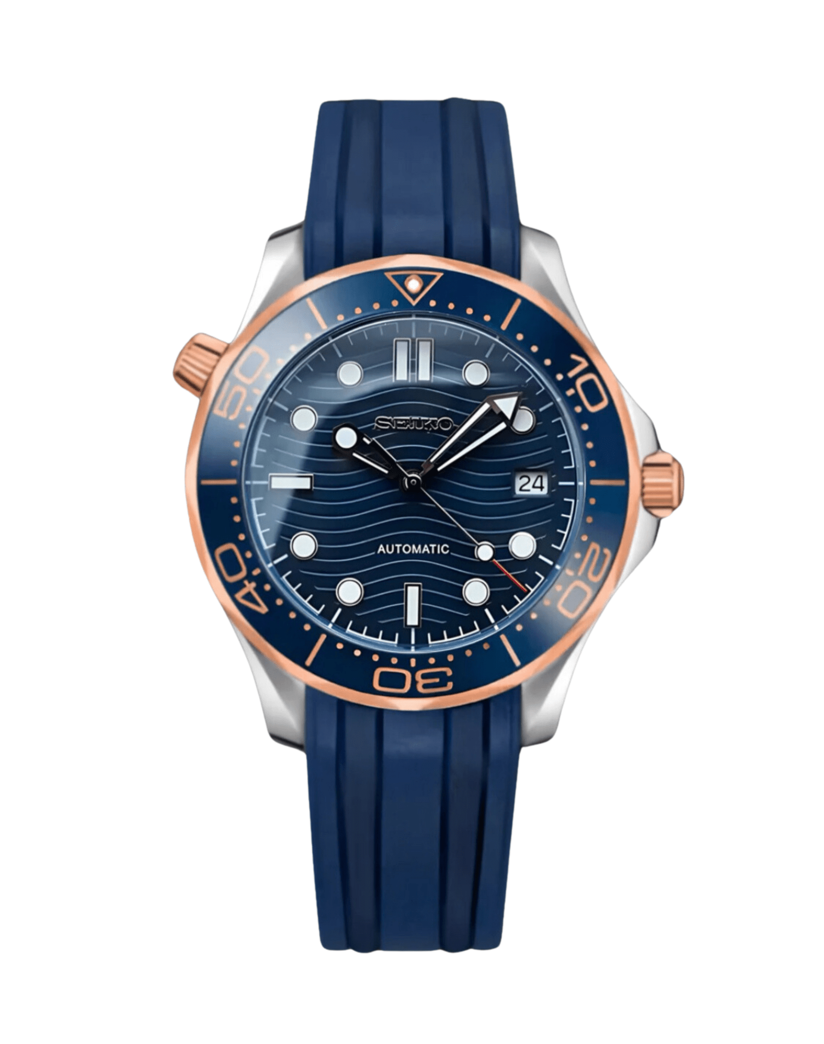 Elevate your style with the Seiko Mod Seamaster Rose Gold Blue, a custom NH35 Automatic Watch, inspired by the iconic Seamaster design. This unique timepiece features a Dark Blue dial, encased in a 40mm stainless steel frame, offering a blend of elegance and precision for watch enthusiasts.