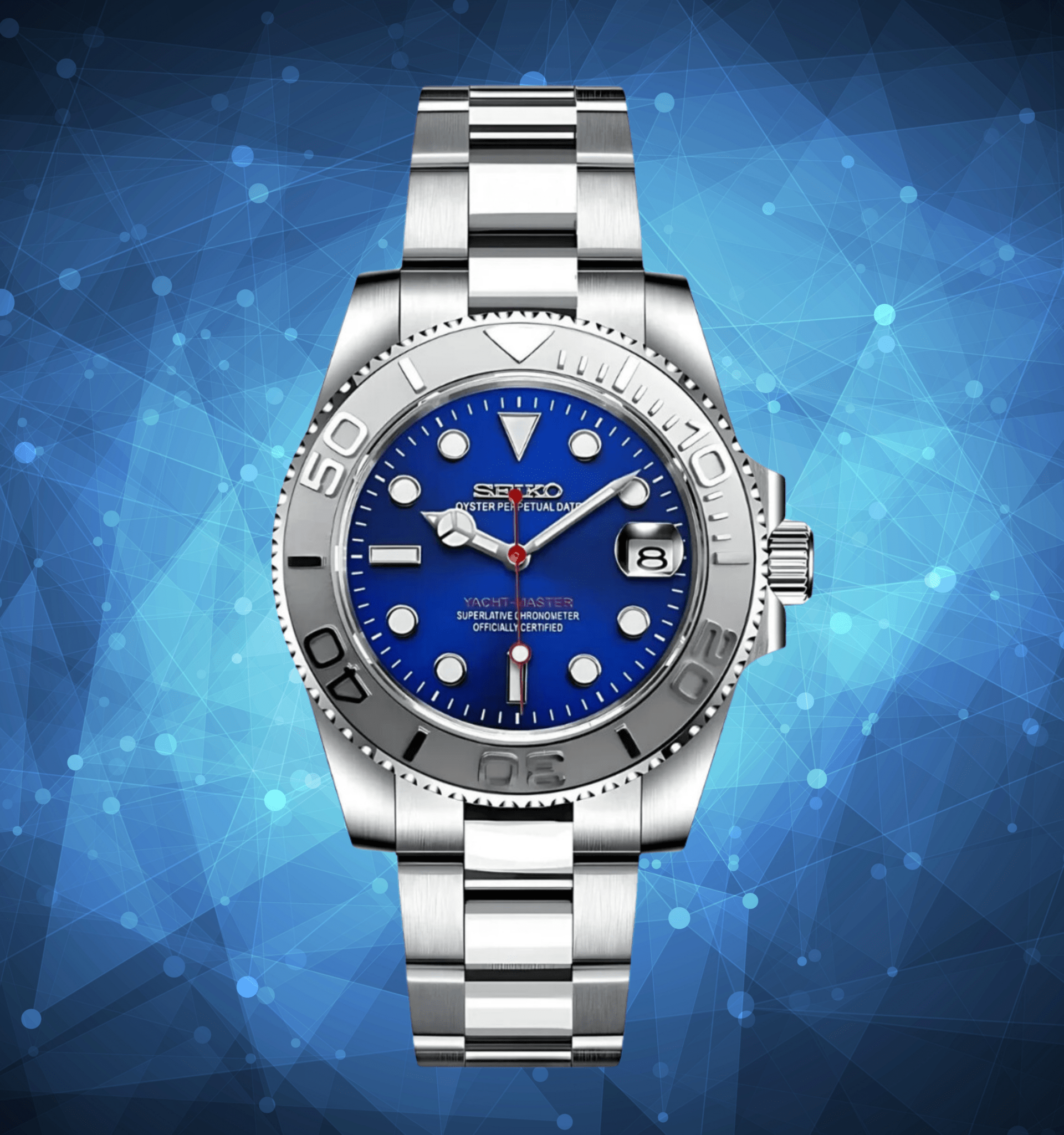 Introducing the Seiko Mod Yacht Master Blue, a custom Seiko NH35 Automatic Watch inspired by the iconic Yacht Master design, meticulously crafted for those who seek elegance and precision. This model features a Blue aftermarket dial, a Silver ceramic bezel, and a transparent back piece, allowing a glimpse into the intricate automatic movement.