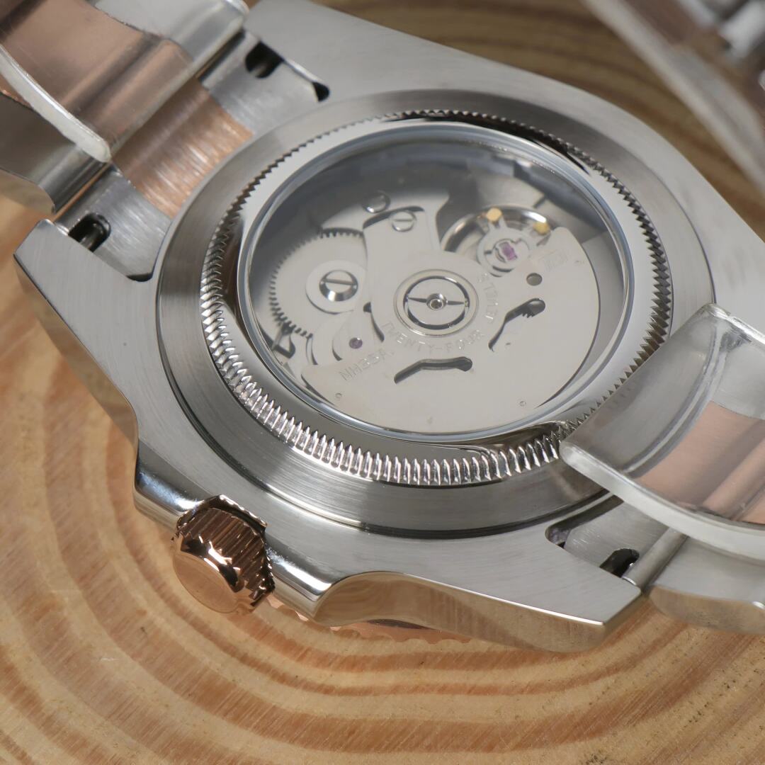 Introducing the Seiko Mod Yacht Master Rose, a custom Seiko NH35 Automatic Watch inspired by the iconic Yacht Master design, meticulously crafted for those who seek elegance and precision. This model features a Rose Gold aftermarket dial, a Rose ceramic bezel, and a transparent back piece, allowing a glimpse into the intricate automatic movement.