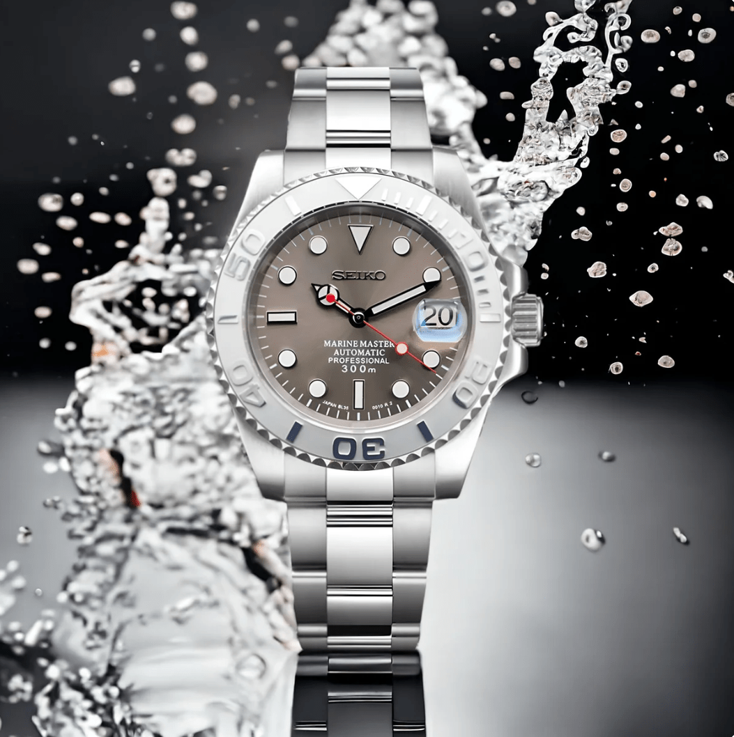Introducing the Seiko Mod Yacht Master Champagne, a custom Seiko NH35 Automatic Watch inspired by the iconic Yacht Master design, meticulously crafted for those who seek elegance and precision. This model features a Champagne aftermarket dial, a Silver ceramic bezel, and a transparent back piece, allowing a glimpse into the intricate automatic movement.