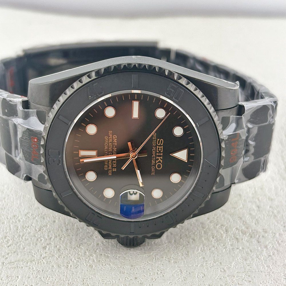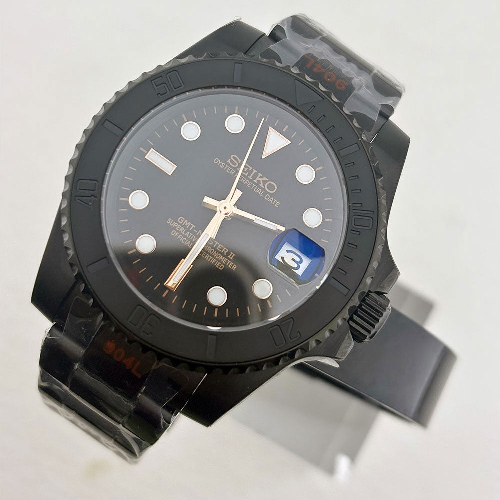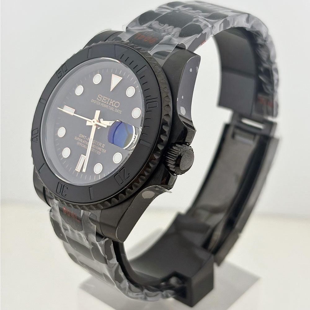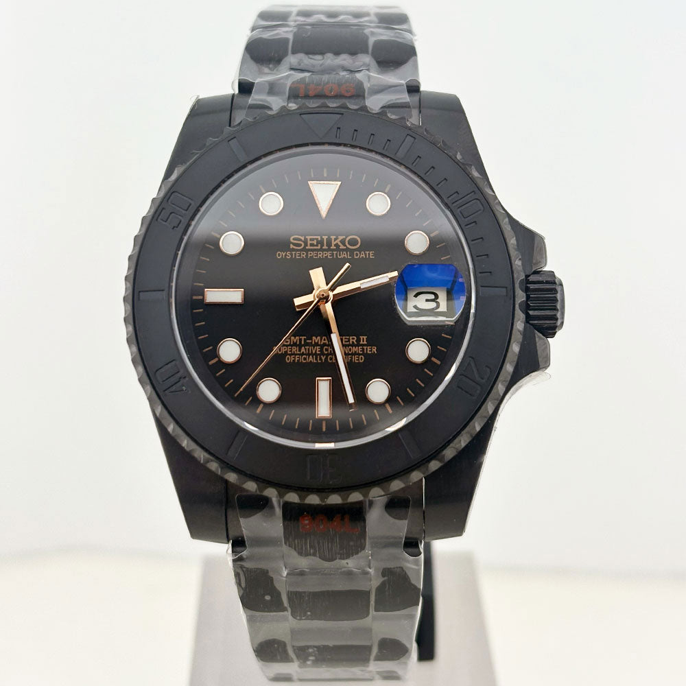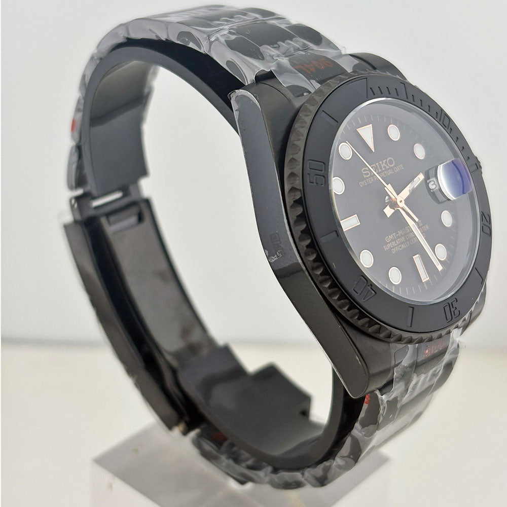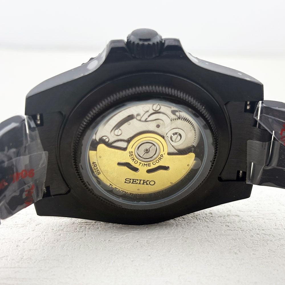 Introducing Seiko Mod Submariner Pepsi, a custom Seiko NH35 Automatic Watch inspired by the iconic Submariner Pepsi, meticulously crafted for watch enthusiasts seeking uniqueness and precision. This mode features a Submariner Black aftermarket dial and a transparent back piece, allowing a glimpse into the intricate automatic movement.